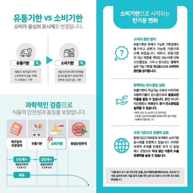 유통기한은 제품의 제조일로부터 소비자에게 유통·판매가 허용되는 기한으로 식품의 판매 가능 기한을 나타내는 것에 반해 소비기한은 보관 방법을 준수할 경우 섭취 시 안전에 이상이 없는 섭취 가능 기한을 알려주는 제도라는데 그 차이점이 있다.