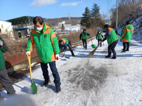김천시 대신동 지역자율방재단(단장 한윤태)이 지난 14일 폭설피해취약지역의 주요고갯길에서 제설작업을 시행했다.