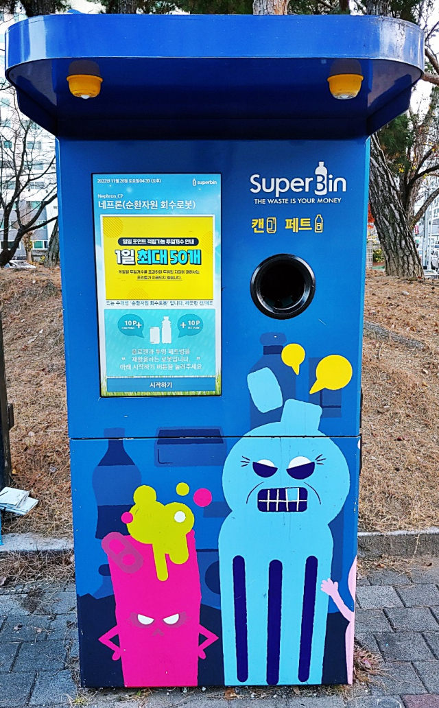 공원에 페트, 캔 쓰레기들이 널려 있는 것을 보면서 쓰레기로 버려지는 것이 아까워 자원재활용할 수 있는 방법이 없을까 고민하던 차에 ‘네프론(수퍼빈)’이라는 자원재활용 무인회수로봇을 발견했다. 귀여운 자판기를 닮은 이 기계는 페트나 캔을 먹으면 포인트를 적립해주고 일정금액이 되면 돈으로 바꿔주니 외관만큼이나 야무지다.