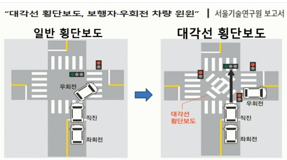 신 의원에 따르면 대각선 횡단보도는 교차로의 기존 횡단 보도 외에 대각선 모양으로 추가 설치해 보행자 신호일 때 모든 차량 통행을 일시 정지시켜 보행자들이 어느 방향으로든 안전하게 건너갈 수 있도록 하는 것. 특히, 사거리 동시 점등으로 모든 차량의 통행이 정지된다는 점에서 안전한 보행환경을 조성할 수 있고 차량 신호일 때 보행하는 사람이 없어 쉽게 우회전할 수 있다는 정점이 있어 시민만족도가 높은 교통체계로 분석되고 있다.