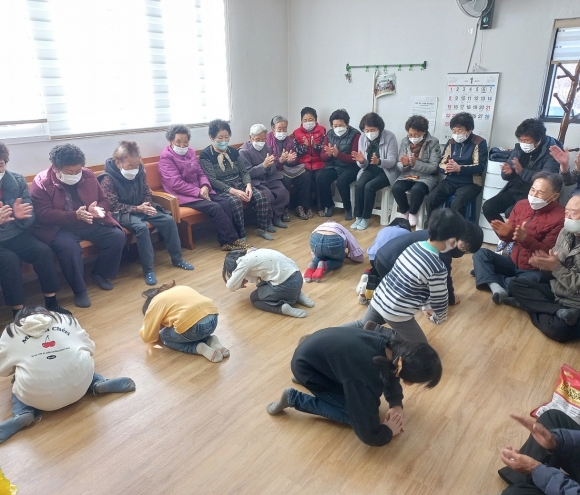 이날 행사는 기묘년 새해를 맞이해 사랑과 나눔을 실천하기 위해 학생 10여 명이 동네 경로당을 찾아 1일 손자·손녀가 되어 재롱 잔치를 벌였다.
