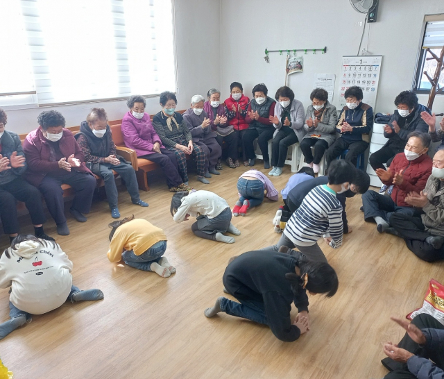 학생들은 ‘지팡이 댄스’와 ‘마술’공연 후 어르신들의 어깨와 등을 안마하고 기묘년 한해 할아버지 할머니의 건강과 행복을 기원하며 큰절을 올린 후 준비한 떡과 과일, 음료수를 같이 나누며 화기애애한 시간을 보냈다.