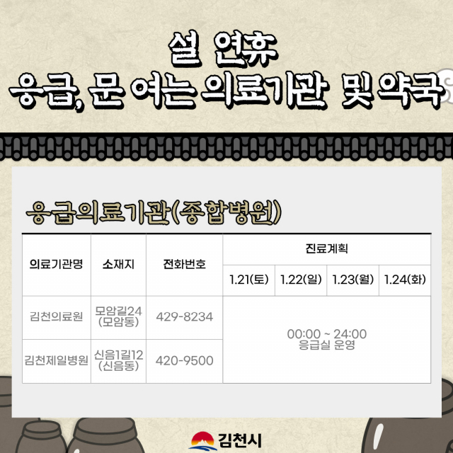 김천시가 설 명절 연휴기간인 21일부터 24일까지 김천시 의사회, 약사회 등과 협조해 응급의료체계를 구축한다고 밝혔다.