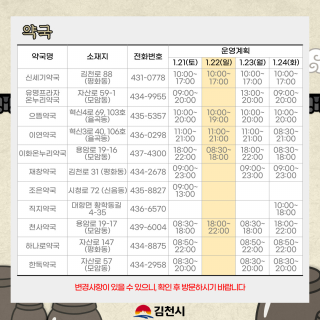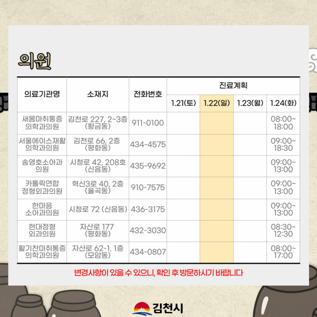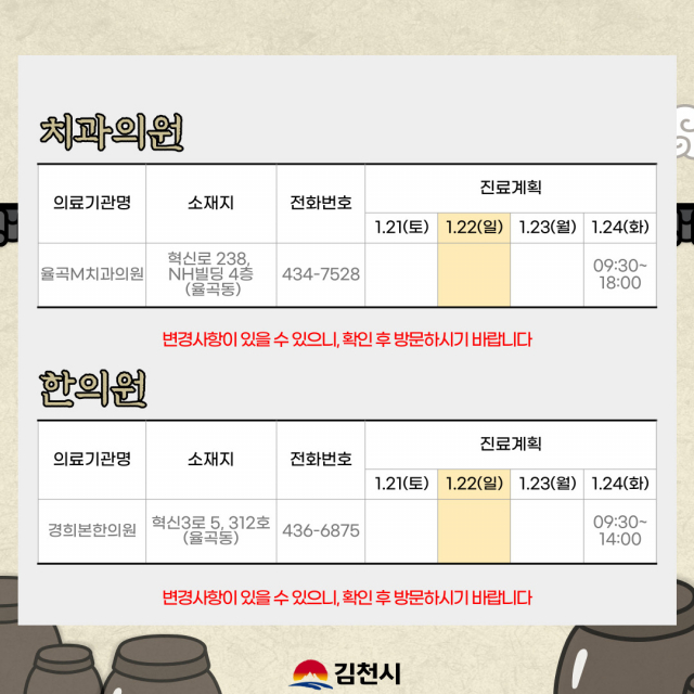 설 연휴기간 중 문 여는 의료기관 및 약국에 대한 정보는 보건복지콜센터(129), 119구급상황관리센터(119), 경상북도콜센터(120), 김천시보건소(433-4000)로 연락하거나 김천시청·김천시보건소 홈페이지, 응급의료포털(www.e-gen.or.kr), 스마트폰 앱(응급의료정보제공), 포털사이트에서 ‘명절 진료’로 검색하면 안내받을 수 있다.
