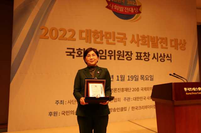 이선희 경북도의원(청도, 국민의힘)이 19일 열린 ‘2022 대한민국사회발전대상’ 시상식에서 지방의회의 위상을 강화하고 자치의정 발전에 기여한 공로를 인정받아 지방자치의정 부문 대상을 수상했다.
