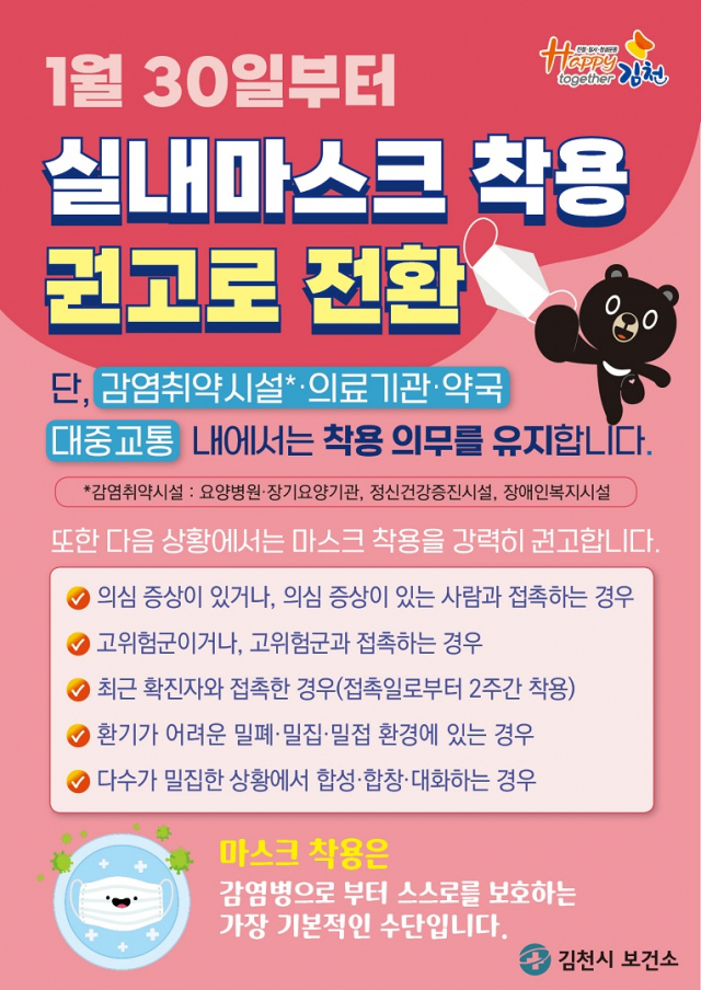 이에 따라 김천시는 효과적인 일상생활 속 방역을 위해 실내 마스크 착용 의무가 해제되더라도 자율적인 실내 마스크 착용과 60세 이상 고령층, 기저질환자 등 감염취약 계층의 코로나19 백신접종의 중요성을 홍보하는 등 시민 안전을 위해 최선을 다할 방침이다.