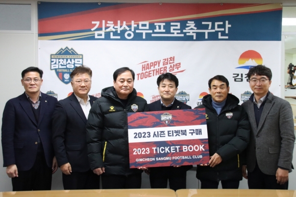 김천상무프로축구단이 지난 27일 NH농협 김천시지부의 티켓북 구매 릴레이 행사를 열었다. NH농협 김천시지부는 김충섭 구단주에 이어 두 번째로 2023 김천상무 티켓북 구매 릴레이의 주인공이 됐다. 이날 행사에는 NH농협은행 박기화 김천시지부장, 강동호 농정지원단장, 김상철 김천시청출장소장, 이남열 총무팀장, 김천상무 배낙호 대표이사, 최한동 후원회장이 참석했다.