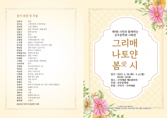 선주문학회(회장 박태원)가 오는 28일부터 구미예총 예갤러리에서 시민과 함께하는 '그리매 나토얀 봄愛시' 시화전을 연다.