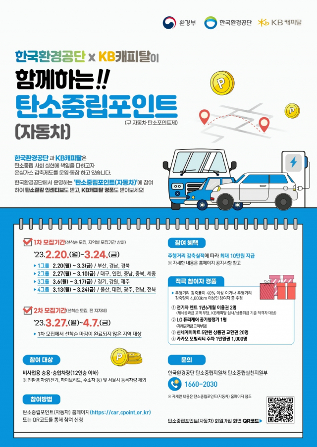 참여희망자는 자동차 탄소중립포인트제 누리집(http://car.cpoint.or.kr)에서 회원가입을 하고, 전송되는 문자 URL을 통해 증빙자료(자동차 계기판, 차량번호판 사진)를 제출하면 된다. 참여자의 주행거리 감축실적에 따라 12월 중 2만원 ~ 최대 10만원의 인센티브를 받게 된다.