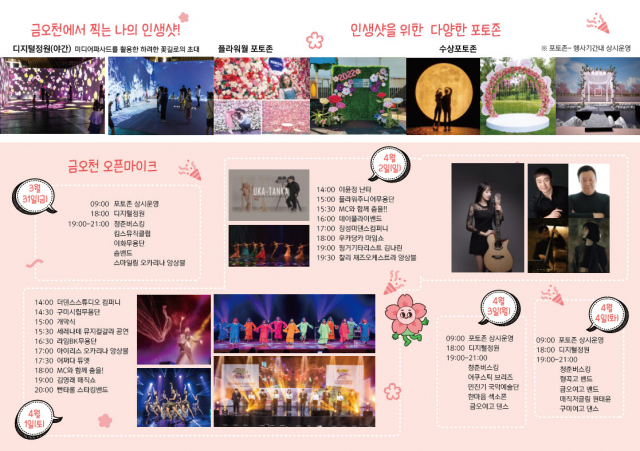 특히 올해는 금오천의 아름다운 벚꽃과 함께 '내 인생 최고의 인생샷 남기기'를 주제로 플라워월(꽃벽), 하천 위 수상 포토존 등 다양한 포토존을 마련했으며, 이외에도 버스킹존, 체험존, 이벤트존, 푸드존 등도 조성했다.