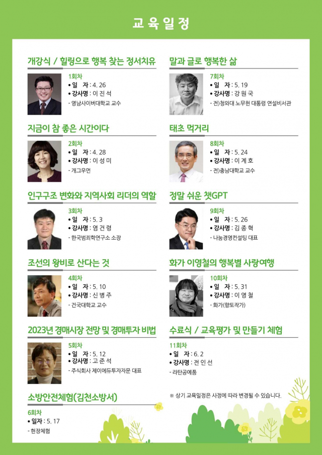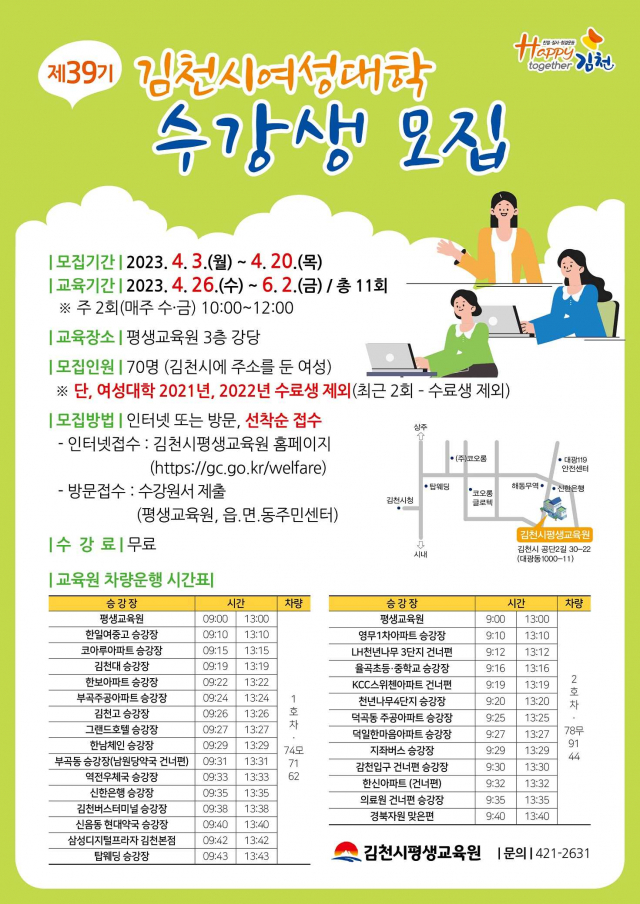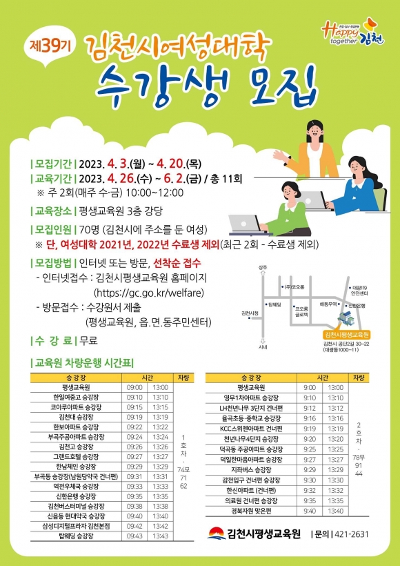 김천시평생교육원이 4월 3일부터 20일까지 2023년 「제39기 김천시여성대학」 수강생을 선착순 모집한다.