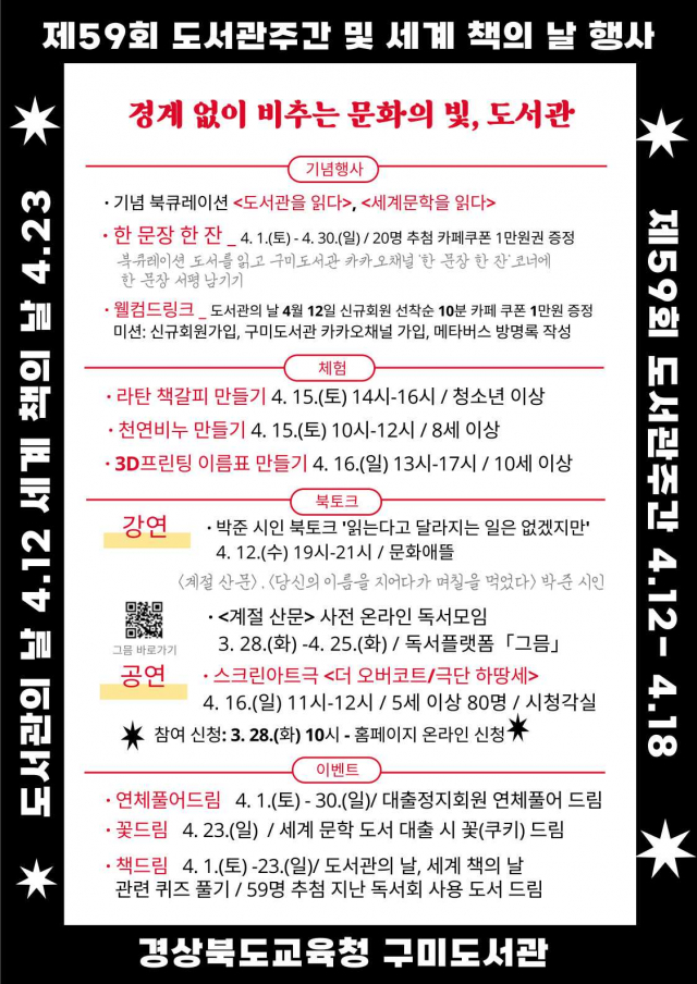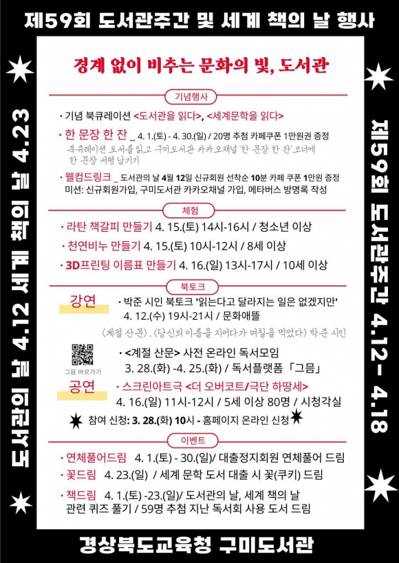 경상북도교육청 구미도서관(관장 장선희)이 제59회 도서관주간 및 세계 책의 날을 맞아 4월 한 달간‘경계 없이 비추는 문화의 빛, 도서관’이란 주제로 다양한 행사를 운영한다고 밝혔다.