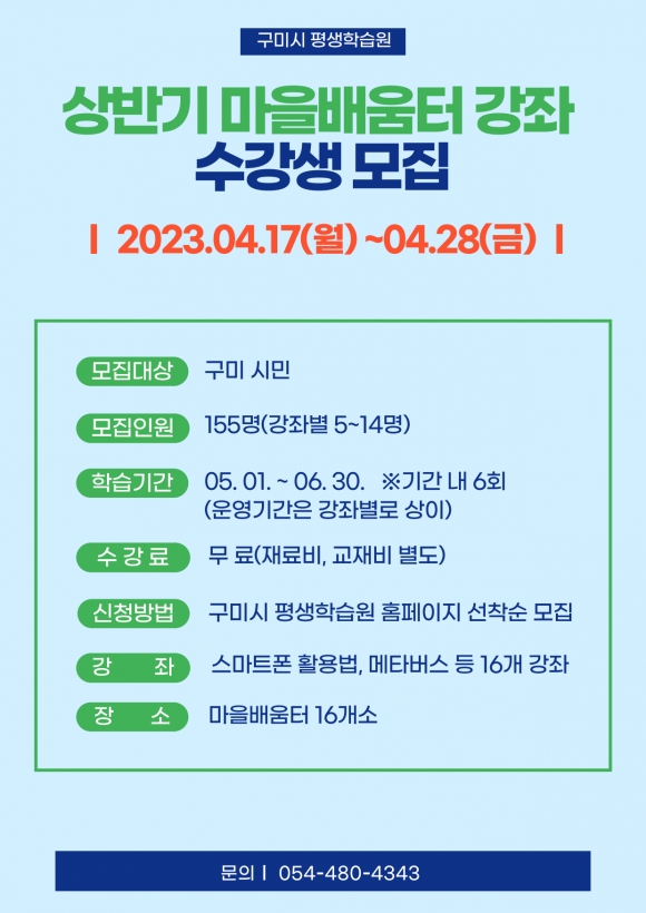 모집기간은 이달 17일부터 28일까지이며 구미시 평생학습원 홈페이지를 통해 신청 가능하다.