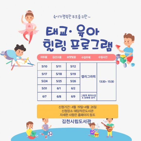 김천시립도서관(관장 신동균)이 5월 10일부터 6월 9일까지 관내 예비부모와 육아부모를 대상으로 ‘글씨드로잉 캘리그라피 ․ 그림책 육아’를 주제로 작은 도서관 3개소에서 힐링프로그램을 운영한다.