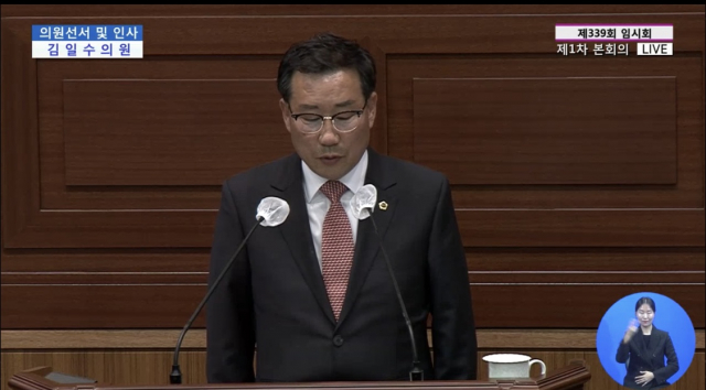 | ↑↑ 지난 5일 재·보궐선거에서 구미시 제4선구 도의원으로 당선된 김일수 의원이 첫 등원해 의원선서를 하고 있다.(본회의 인터넷방송 캡쳐) |
