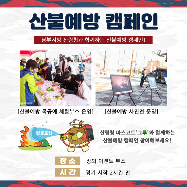홈경기 장외 이벤트부스에서 산불예방 홍보 캠페인을 실시한다. 남부지방산림청은 목공예 체험 부스 운영과 함께 산불예방 캠페인 사진전을 진행한다. 산림청 마스코트 ‘그루’도 함께 장외 이벤트 구역에서 팬들을 맞을 예정이다. 하프타임에는 산불예방 퀴즈 이벤트를 진행하며 경기장 내에는 산불예방 홍보 현수막을 설치한다.