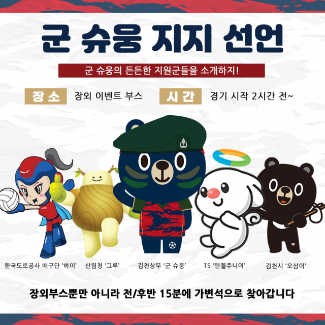 2023 K리그 마스코트 반장선거가 5월 1일부터 14일까지 진행된다. 마스코트 반장선거 본투표를 하루 앞두고 김천은 홈경기에서 사전 홍보를 진행한다. 슈웅이네 PX(매점)에서는 일일 PX병으로 ‘군슈웅’을 운영한다. Kick 어플리케이션 설치 후 PX에서 인증 시, 선착순 500명에게 한정판 건빵을 증정할 예정이다.