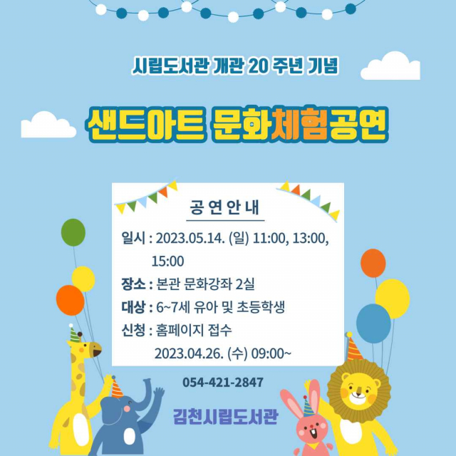 신동균 김천시립도서관장은 “도서관 개관 20주년을 맞아 기존 공연과 다른 샌드아트 문화체험공연을 개최해 우리 아이들이 문화공연을 관람하는 것에 그치지 않고 직접 체험하고 배워보는 특별한 시간을 보냈으면 한다.”고 말했다.