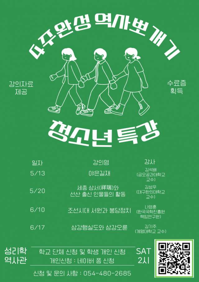 또 지역의 중·고등학생들을 위한 청소년특강도 준비했다. 이달 13일과 20일에 야은길재, 세종 상서와 선산 출신 인물들의 활동을, 6월 10일과 17일에는 조선시대 서원과 붕당정치, 삼강행실도와 삼강오륜역사특강을 진행한다. 이는 대학입시 및 자유학기제에 있는 중·고등학교 학생들의 학습활동에 실질적인 도움을 주기 위해 기획됐으며, 강의자료 및 학습활동지, 수료증을 지급한다. 교육프로그램에 참여하고자 하는 학생은 구미성리학역사관 홈페이지 및 안내지 큐알코드를 통해 신청할 수 있다.