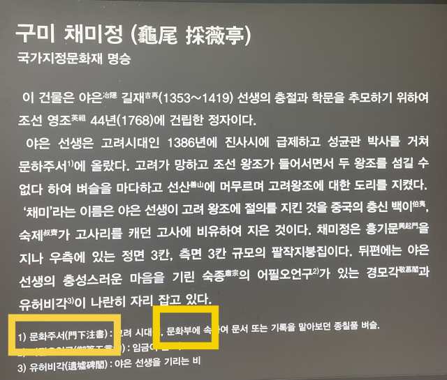 구미 채미정 안내판에는 "야은 선생이 고려시대 1386년 진사시에 급제하고 성균관 박사를 거쳐 문하주서에 올랐다"고 설명하면서 각주를 달았다. 하지만 각주에서 '문하주서(門下注書)'를 '문화주서'로, 또 '문하부'를 '문화부'로 잘못 표기하고 있다. 또 안내도에는 관리사의 한자 표기를 '舍(집사)'를 사찰을 뜻하는 '寺(절사)'로 표기한 채 관람객을 맞고 있다.