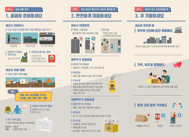 김충섭 시장은 “각종 위기 상황이 발생했을 때 자신과 가족의 생명을 지키기 위해 국민 행동 요령을 반드시 숙지하고 있어야 한다”며, “시민들께서는 평상시 구급약품과 방독면 등 비상용품을 확보해 달라”고 당부했다.