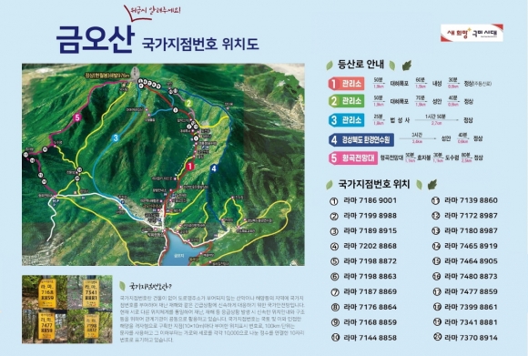 구미시가 탐방객과 시민이 많이 찾는 금오산 등산로 주요 지점에 국가지점번호판 20점을 설치했다.