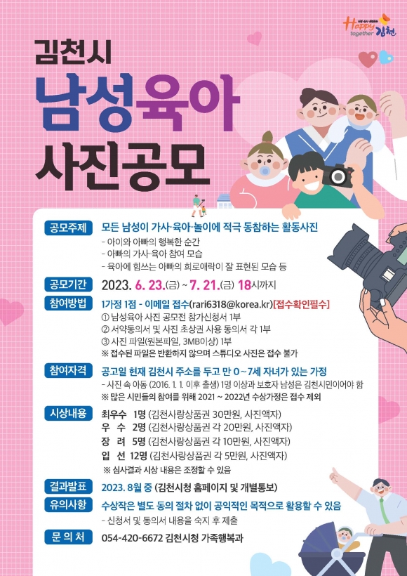 현재 김천시에 주소를 둔 만 0세부터 7세까지의 자녀가 있는 가정에서, 남성의 육아·가사·놀이 활동 모습 등 일상생활 속에서의 희로애락을 담은 사진을 온라인으로 응모할 수 있다.