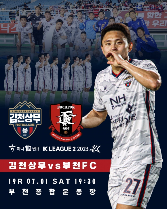 김천상무프로축구단이 7월 1일 오후 7시 30분, 부천종합운동장에서 부천FC와 ‘하나원큐 K리그2 2023’ 19R 원정 경기를 치른다. 김천은 6월 두 번의 홈경기에서 안산, 천안시티FC를 꺾고 2연승을 차지하며 승점 6점을 챙겼다. 승점을 차곡차곡 쌓은 김천은 선두 안양과 승점 차를 1점 차로 줄였다. 맞대결 상대인 부천은 김천과 승점이 30점으로 같다. 한 경기의 승패에 따라 순위가 뒤바뀔 전망이다.