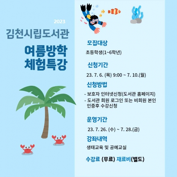 김천시립도서관(관장 신동균)이 23년 여름방학 체험특강 수강생을 6일부터 10일까지 모집한다.