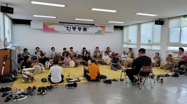 '2023 어르신문화활동 지역맞춤형 노년문화활동 지원(경북)사업의 일환으로 진행되는 인동풍물은 인동지역 어르신들이 중심이 되어 일제강점기와 산업화, 도시화를 거치면서 사라져가는 인동풍물을 기억하고 배워 인동풍물을 전승함과 동시에 건전한 여가활동과 문화활동을 위해 진행된다.