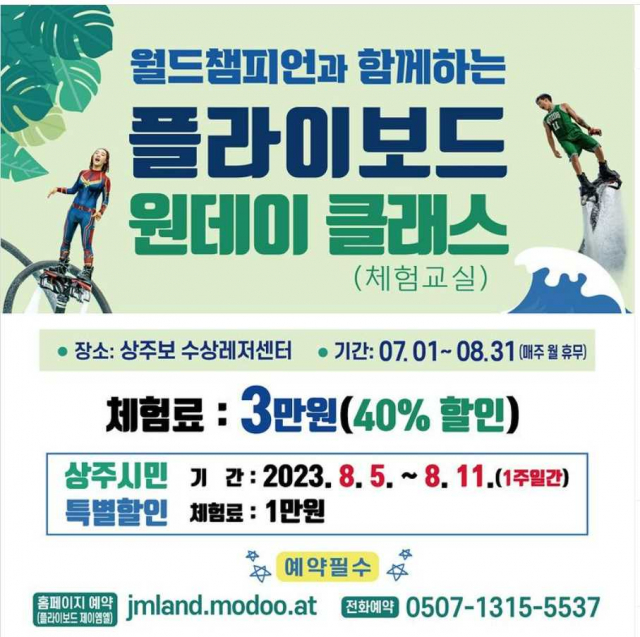 또 플라이보드 원데이클래스가 8월 31일까지 상주보 수상레저센터에서 운영된다. 시간은 10시에서 18시까지, 만10세이상 체험가능하다. 이용요금은 정상가 5만원에서 40% 할인된 3만원, 상주시민은 8월 5일에서 11일까지 체험료 1만원으로 이용할 수 있다. 홈페이지https://jmland.modoo.at/, 0507-1315-5537 사전예약해야한다.