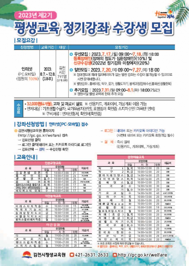 김천시평생교육원이 '2023년 제2기 평생교육 정기강좌'를 17일부터 우선 모집을 시작으로 8월 1일까지 선착순 모집한다고 밝혔다.