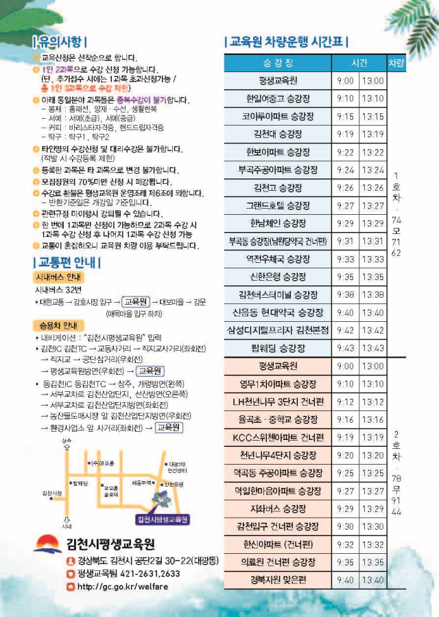 이번 2기 수강생 모집인원은 1기 때보다 43명 증원해 많은 시민이 평생교육에 참여할 수 있도록 지원할 예정이다. 수강료는 4개월간 32,000원이고 김천시평생교육원 홈페이지(http://gc.go.kr/welfare)를 통해 선착순으로 수강 신청이 가능하다.