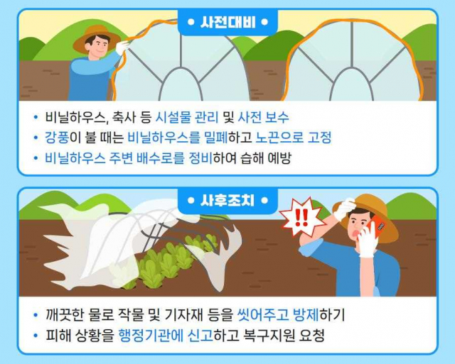 벼는 배수로 잡초 제거 및 물길 정비로 침수가 되지 않도록 해야 하며, 채소를 비롯한 밭작물도 고랑 및 배수로를 정비해 습해를 예방하고 작물이 쓰러지지 않도록 줄 지주를 설치하고 병해충 예방을 위해 사전에 방제해야 한다.