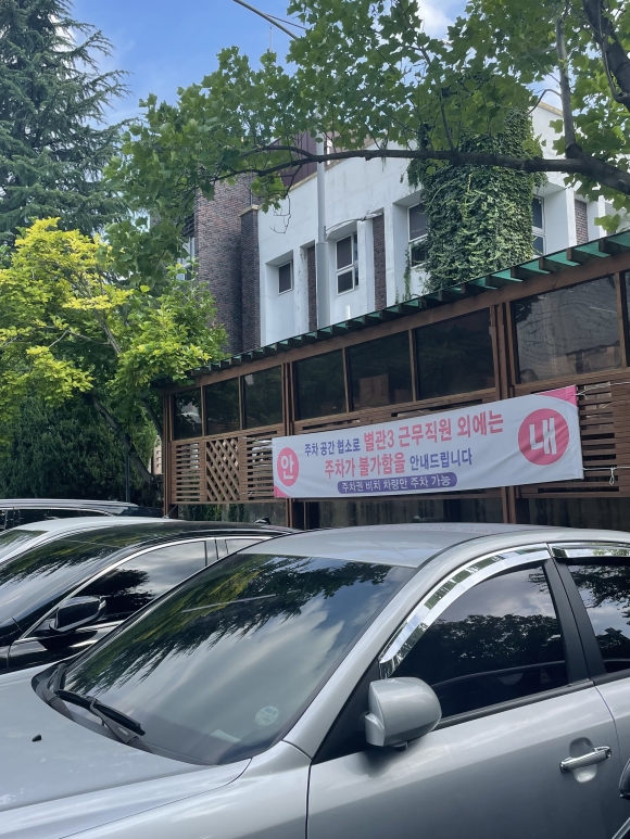 4일 시청 별관3 주차장 벽면에는 '주차 공간 협소로 별관3 근무직원(공무원) 외에는 주차가 불가하다'는 안내 현수막이 걸려 있다. 즉, 공무원 외에는 주차를 하지 말라는 것이다.