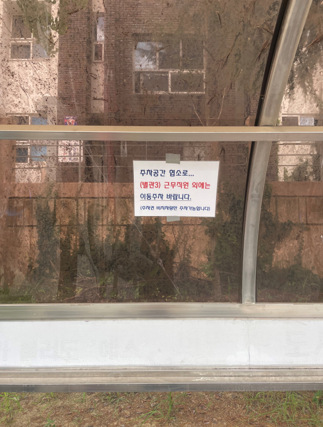 | ↑↑ 현수막도 모자라 주차장 벽면에 '직원 외에는 이동주차하라'는 안내 메모까지 붙여 공무원 전용 주차장임을 강조하고 있다. |