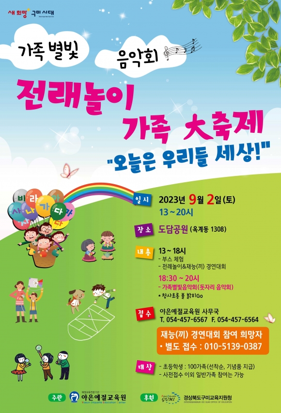 구미시 야은예절교육원에서 전래놀이와 함께 하는 가족별빛음악회를 옥계 도담공원에서 9월 2일 개최한다.
