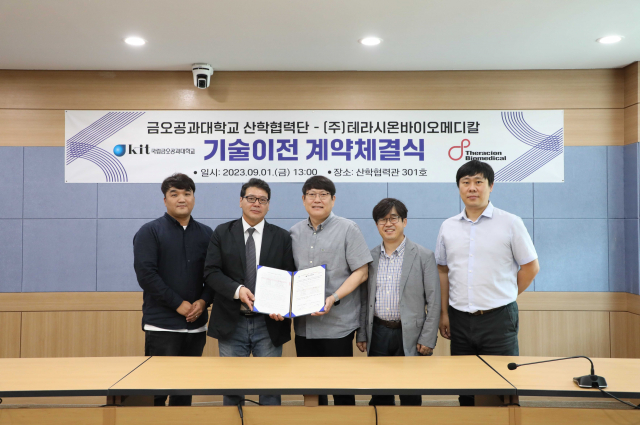 국립금오공과대학교(총장 곽호상)가 바이오 유망 중소기업 기술부양을 위해 나선다. 금오공대 산학협력단(단장 권오형)은 1일 산학협력관 회의실에서 바이오서저리 전문기업 ㈜테라시온바이오메디칼(대표 김은진)과 ‘급속 지혈제 기술’관련 기술이전 계약을 체결했다.