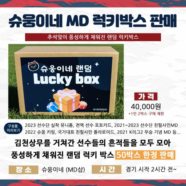 슈웅이네(MD샵)에서는 추석맞이 MD 럭키박스를 판매한다. 전역 선수 티셔츠, 선수 실착 유니폼 상·하의, 전역 선수 친필사인 응원타올, 전역 선수 포토카드, 슈웅 인형, 가방걸이 인형 등 다양한 상품들로 구성돼있다. 선착순 50개 판매 예정이며 가격은 4만원이다.