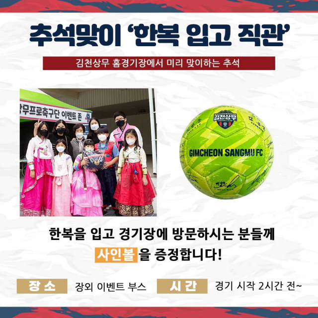 장외 이벤트 구역에서도 추석 다양한 이벤트들이 준비돼 있다. 전통 민속놀이 체험과 추석맞이 ‘한복 입고 직관’ 이벤트를 실시한다. 한복 입고 직관 인증 시 김천상무 사인볼을 증정한다. 입장게이트에서는 선착순으로 추석맞이 왕부채, 럭키 복주머니를 증정한다.