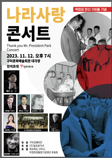구미오페라단(대표 박영국)이 오는 12일 구미문화예술회관 대공연장에서 박정희 대통령 탄신 106돌 기념 '나라 사랑 음악회'를 연다.