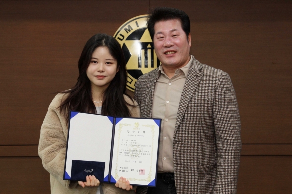 | ↑↑ 장학금을 전달 받은 이하늘 학생과 강호원 회장 (구미대 제공) |