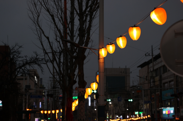 | ↑↑ 상주시가지 가로수에 수놓인 상주곶감축제 성공기원 곶감등 점등(상주시 제공) |