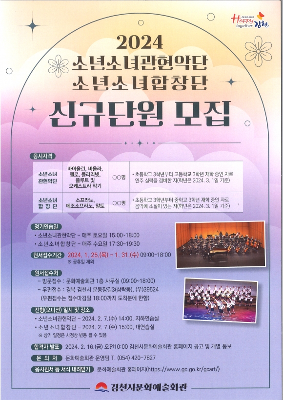 모집분야는 소년소녀관현악단(일반단원), 소년소녀합창단(일반단원)으로, 25일부터 31일까지 5일간 원서를 받는다. 각 응시자는 구비서류를 지참해 김천시문화예술회관 사무실로 방문하거나 우편 접수(접수 마감일 18:00까지 도착)를 하면 된다. 전형은 실기와 면접전형으로 실시되며, 합격자는 2월 16일 문화예술회관 누리집을 통해 발표할 예정이다. 최종합격자는 3월 1일부터 단원으로 위촉된다.