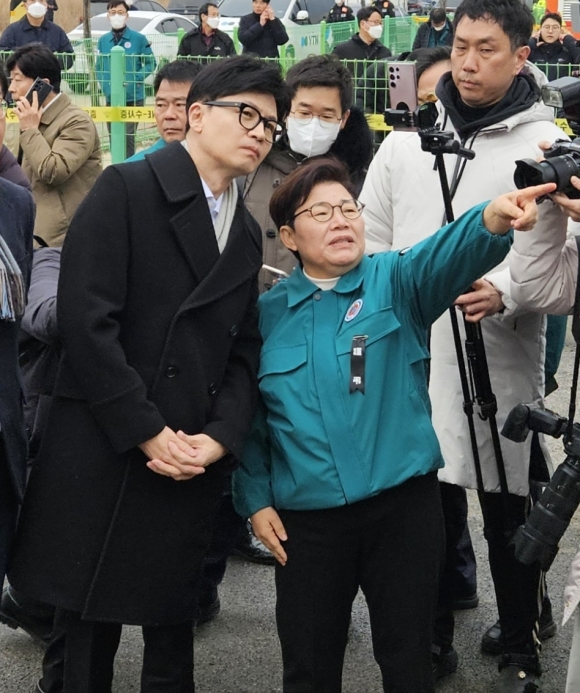 ↑↑ 임이자 국회의원(상주·문경)이 한동훈 비상대책위원장에게 화재현장에 대한 보고를 하고 있다.(임이자 의원실 제공)