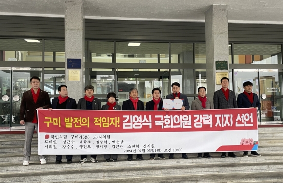 국민의힘 구미시(을) 도·시의원 10명이 5일 구미시청 현관 앞에서 기자회견을 열고 "구미 발전을 위해 반드시 힘 있는 재선 의원이 절실히 필요하다"며 김영식 현 국회의원을 지지 선언했다.