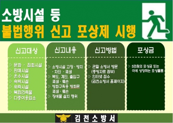 김천소방서(서장 안영호)가 화재 등 각종 사고 발생 시 신속한 대피와 소방시설 확보를 위한 ‘소방시설 등 불법행위 신고포상제’를 운영한다고 밝혔다.