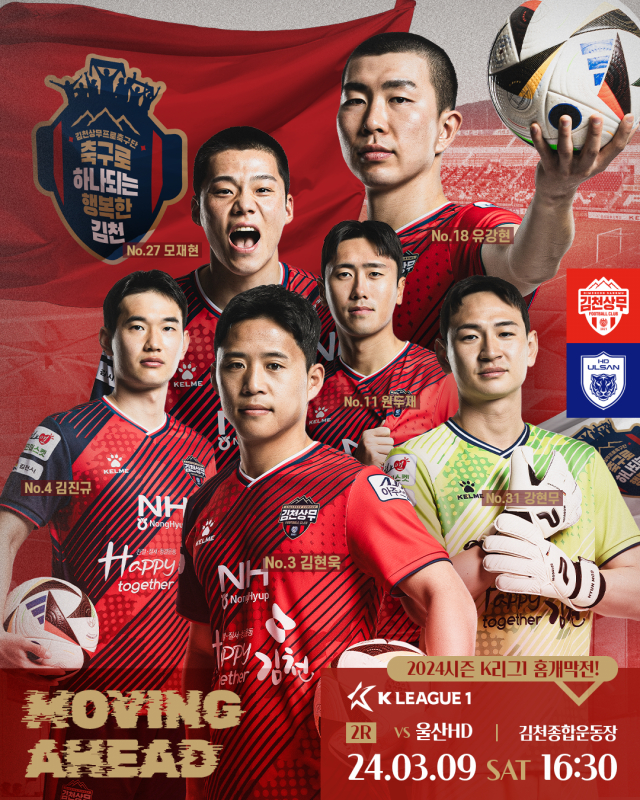 김천상무프로축구단(대표이사 배낙호)이 9일 오후 4시 30분 김천종합운동장에서 울산 HD FC(이하 울산)와 ‘하나은행 K리그1 2024’ 2R 경기를 치른다. ‘K리그2 우승팀’ 김천은 ‘K리그1 우승팀’ 울산을 상대로 2연승에 도전한다.