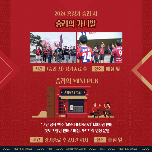 장내에서는 많은 축구명곡을 만든 트랜스픽션이 김천상무 공식 응원가를 최초 공개한다. TV, 청소기, 세탁기, 냉장고 등의 경품추첨과 선수카드 수집이 가능한 카드 컬렉션 이벤트도 진행된다.