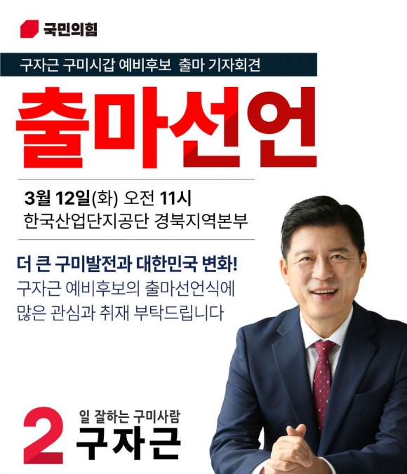 구자근 예비후보(국민의힘, 구미시갑)가 12일 11시 구미 국가1산업단지 내 산업단지공단 경북지역본부 앞뜰에서 출마 선언을 진행할 예정이라고 밝혔다.